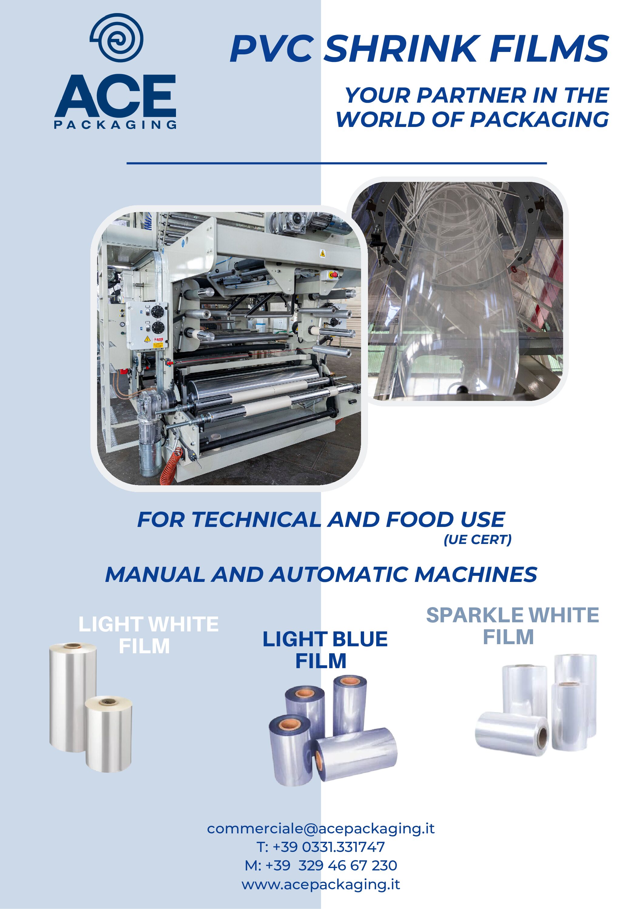 Ace Packaging SRL specializes in the production and sales of high-quality PVC shrink films and flexible packaging solutions. Innovation, tailored formulations, and advanced machinery ensure performance for both standard and niche markets. We produce shrink film for technical and food use with UE Certification.