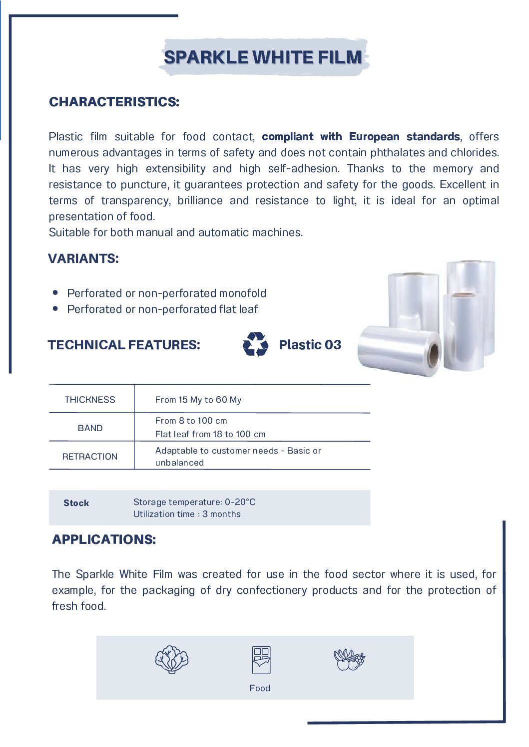 Il a une très grande extensibilité et une auto-adhésion élevée. Grâce à la mémoire et à la résistance à la perforation, il garantit protection et sécurité à la marchandise. Excellent pour la transparence, la brillance et la résistance à la lumière, il est idéal pour une présentation optimale des aliments. Pour machines manuelles et automatiques.Le Sparkle White Film a été créé pour être utilisé dans l’industrie alimentaire, par exemple pour l’emballage de produits de confiserie secs et pour la protection des aliments frais.